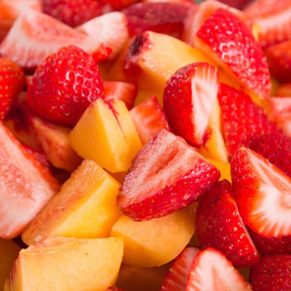 A delectable fruit bowl of ripe strawberries, sweet tangerines, watermelon chunks, and peach slices, drizzled with a lemon sugar glaze.